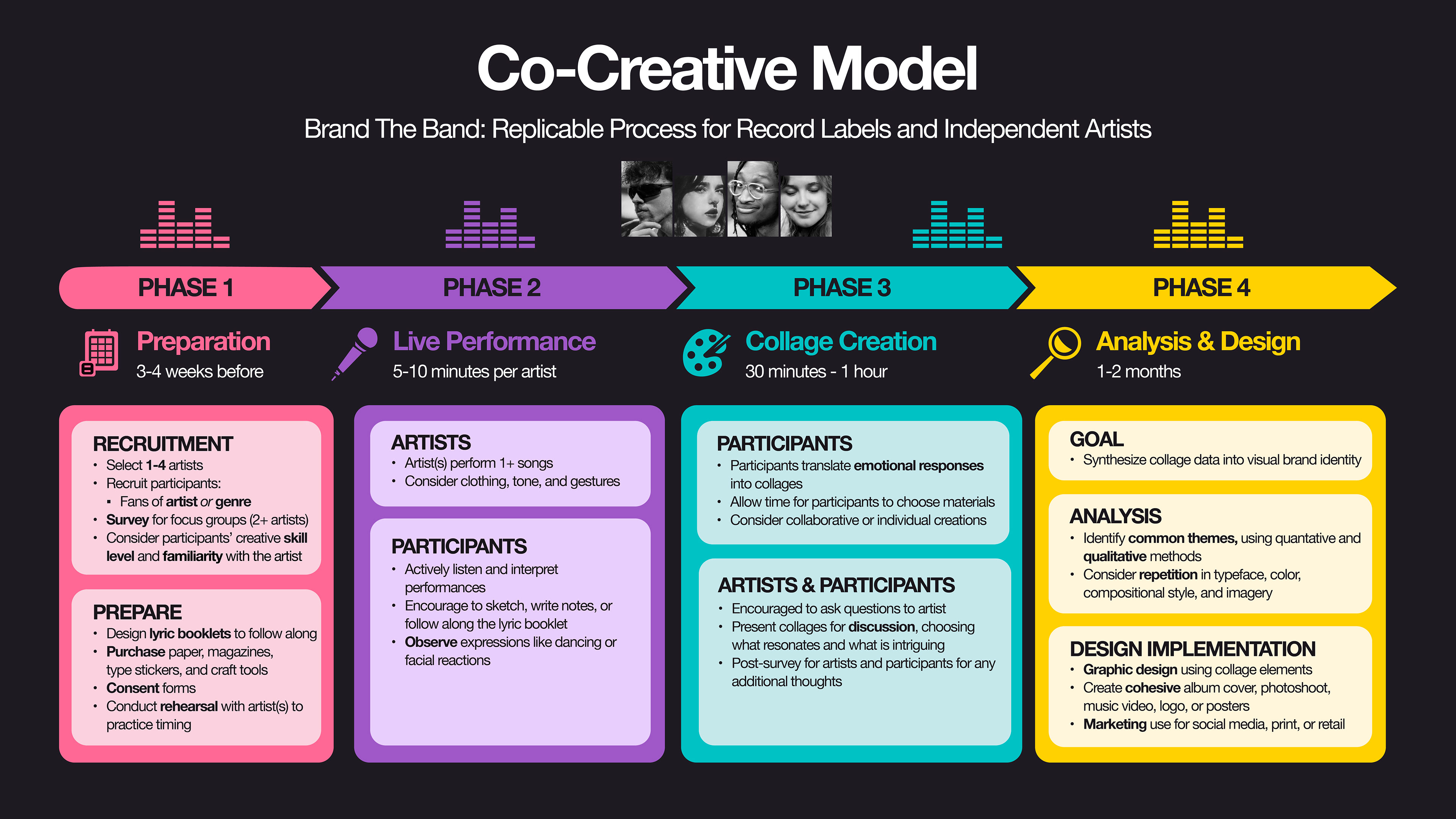 Through a structured co-creative workshop approach, I designed a systematic methodology for guiding the design process of an artist's brand. After watching and experience live performances from four artists, participants in focus groups were tasked to create collages based off of the "vibe" they perceived for each artist. The collage data was then used to inform the final album covers for each artist.